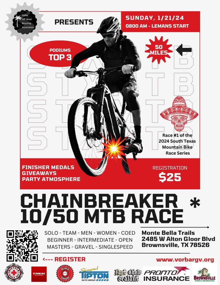 Valley Off-Road Bicycle Association (VORBA) presents the 2024 South Texas Mountain Bike Race Series. This series will consist of six (6) races across trails in the Rio Grande Valley, starting in Brownsville to Mission, and back! Multiple MTB cross-country race types will be offered – marathon (XCM), short track (XCC), Olympic distance (XCO), and eliminator format (XCE). This will be a point series by age categories, with the top racers crowned at the end of the year!