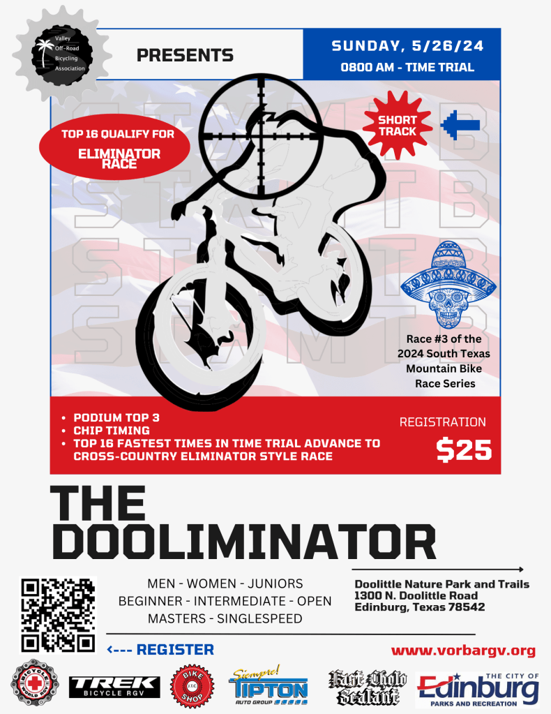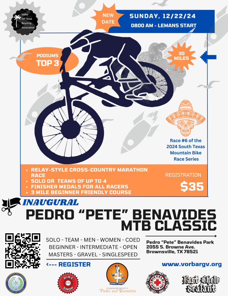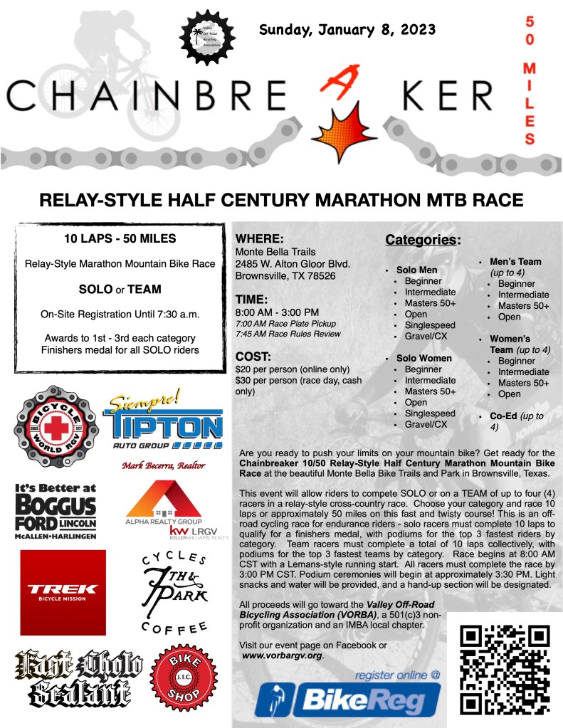 The Valley Off-Road Bicycling Association (VORBA) is a 501(3)(c) non-profit membership organization under the International Mountain Bike Association (IMBA) local chapter program. It’s mission is to create, enhance and preserve great trail experiences for cyclists in the Rio Grande Valley, and to preserve, protect and promote mountain and gravel bike access for diverse riding opportunities on Texas’s public and private lands through education, communication, and unified action.