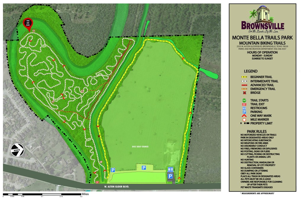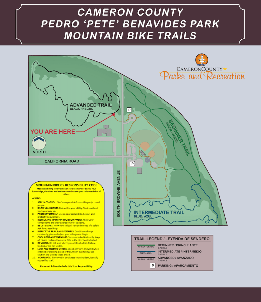 Difficulty Level: The Harlingen Arroyo Hike and Bike Trails consist of five areas – Henry Roberts Loop (approx. 2.5 miles), Recluse (approx. 1 mile), Six Shooter Junction (approx. 1 mile), C.B. Woods (approx. 1 mile), The Dragonback (approx. 1 mile) and The Thicket (approx. 2.6 miles). All areas are connected by the Arroyo Hike and Bike paved trail, which itself connects Arroyo Park, McKelvey Park, C.B. Woods Park, and Dixieland Park in the heart of the city of Harlingen. The trail is mostly green (easy), with several blue (intermediate) trail features such as drops, jumps, steep climbs and skinny wood bridges. One section of Henry Roberts Loop, called “The Hub”, is being developed as a MTB skills section, with several options to ride green, blue, and eventually single black jumps.