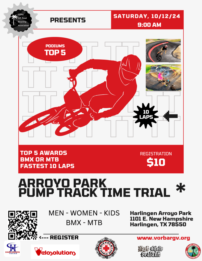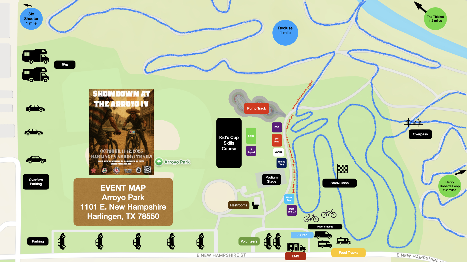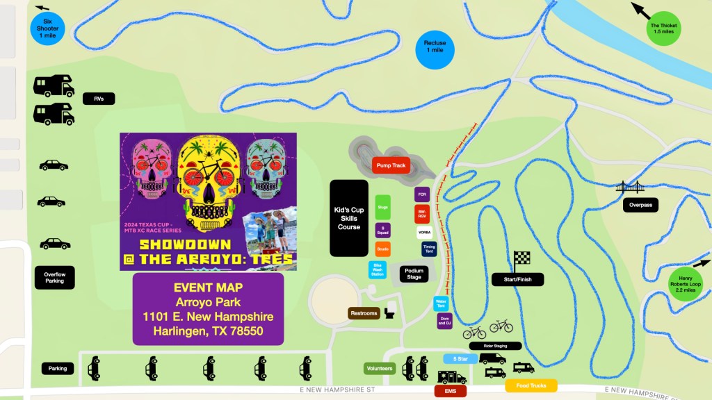 Henry Roberts Loop: at 2.5 miles, HRL is the biggest segment of the course. You will climb up the paved hike ‘n bike back to Arroyo Park, then enter HRL under the overpass bridge. HRL is a mix of tight singletrack, several drops and punchy climbs, and ends with the challenging “Rick’s Revenge” section that will challenge your technical prowess. You will come back down to the paved hike ‘n bike, then climb back up to Arroyo Park, ride the overpass bridge that will spit you back onto the open field to the finish line.