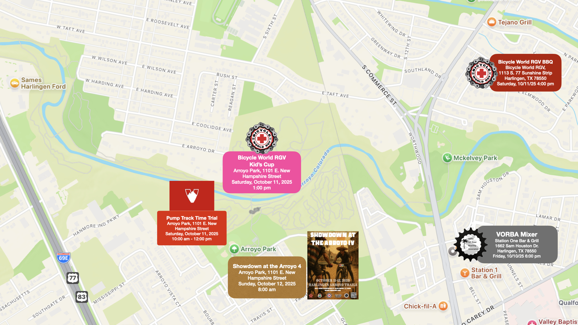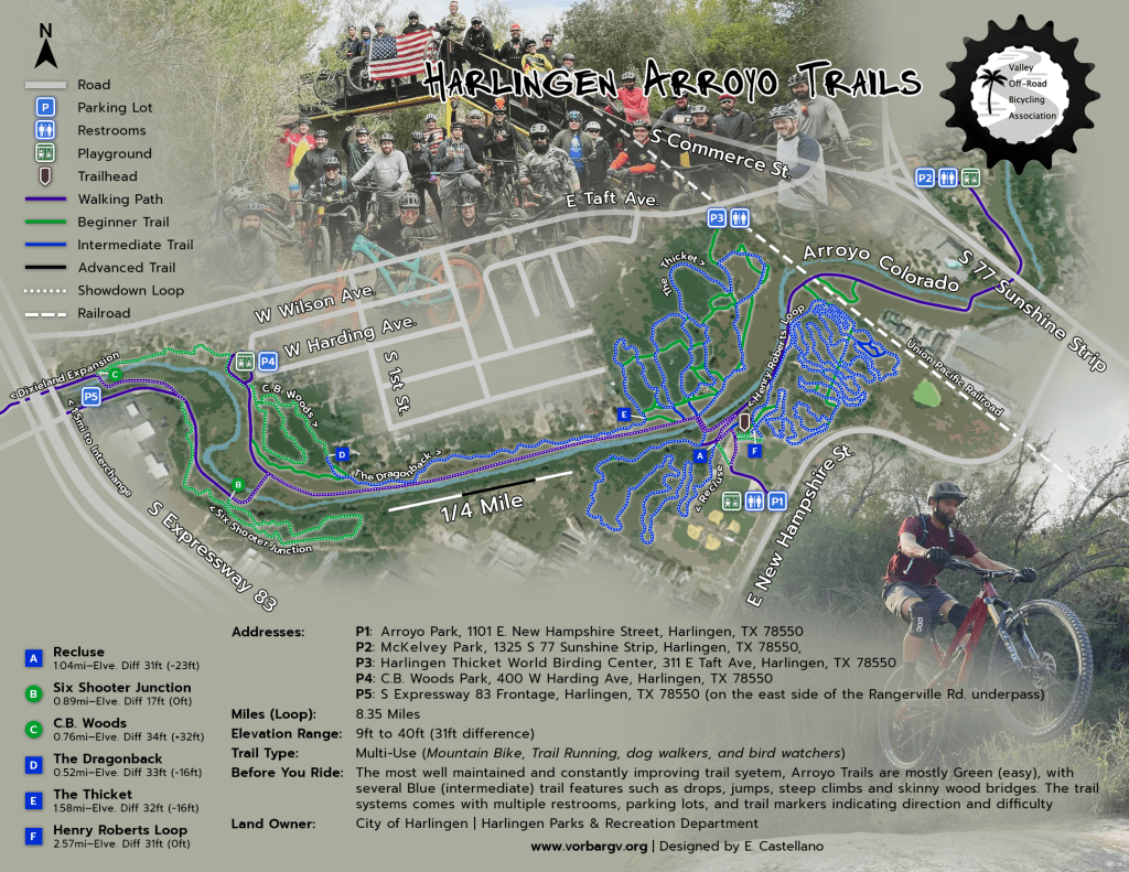 The Harlingen Arroyo Trails are seven segments connected by the paved hike ‘n bike trail and several wood bridges. Many people are surprised at the elevation and technicality of our course, which was built by hand by our trail builders and volunteers. You will start and finish the race in the open field at Arroyo Park. Here is the order of trail segments you will race: